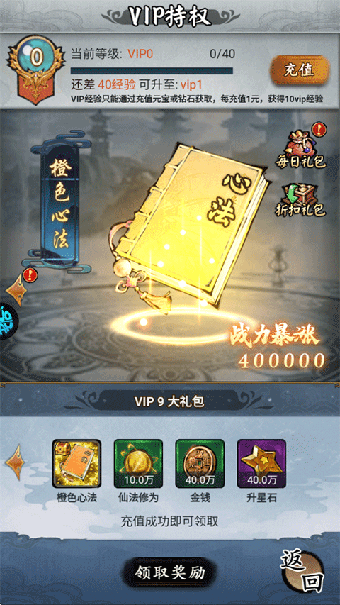 10、VIP9:橙色心法、仙法修为*10w、金钱*40w、升星石*40w。