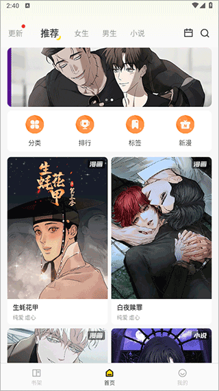 1、进入软件首页即可通过分类、排行、标签来快速检索自己喜欢的漫画。