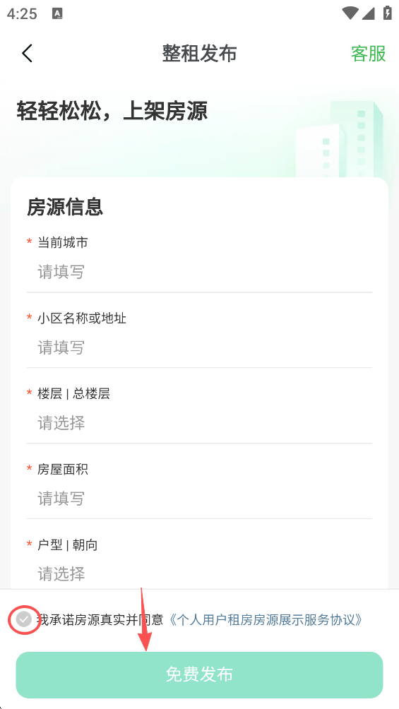4、输入相关信息后,勾选屏幕底部的“我承诺财产…”,然后点击屏幕底部的”免费发布“。