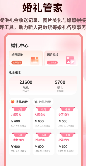 提供电子礼金簿功能,支持按宾客、关系分类记录,并自动生成统计报表。同时,婚礼预算管理工具帮助新人合理分配各项开支,实时掌握婚礼消费情况,避免超支。