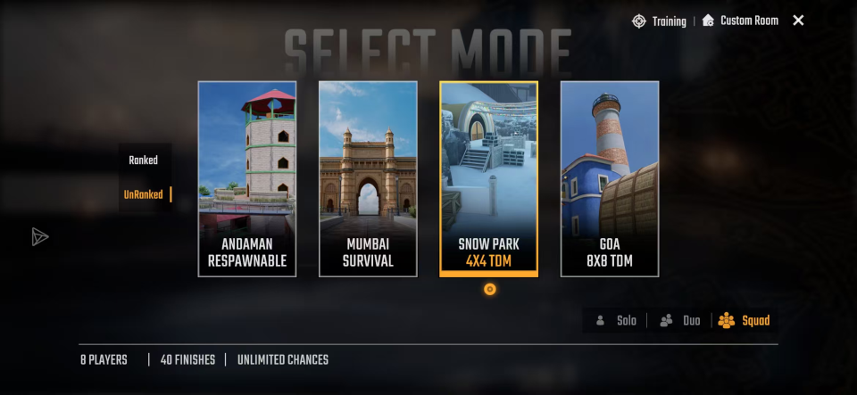 3、团队死亡竞赛(TDM)分为两种规模,雪地公园的 4v4 小规模战斗与果阿的 8v8 大规模对抗,支持无限复活,节奏快,以团队击杀数定胜负。