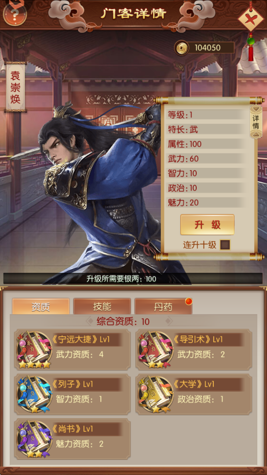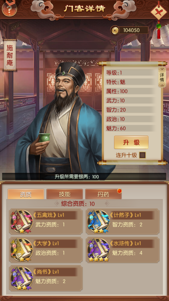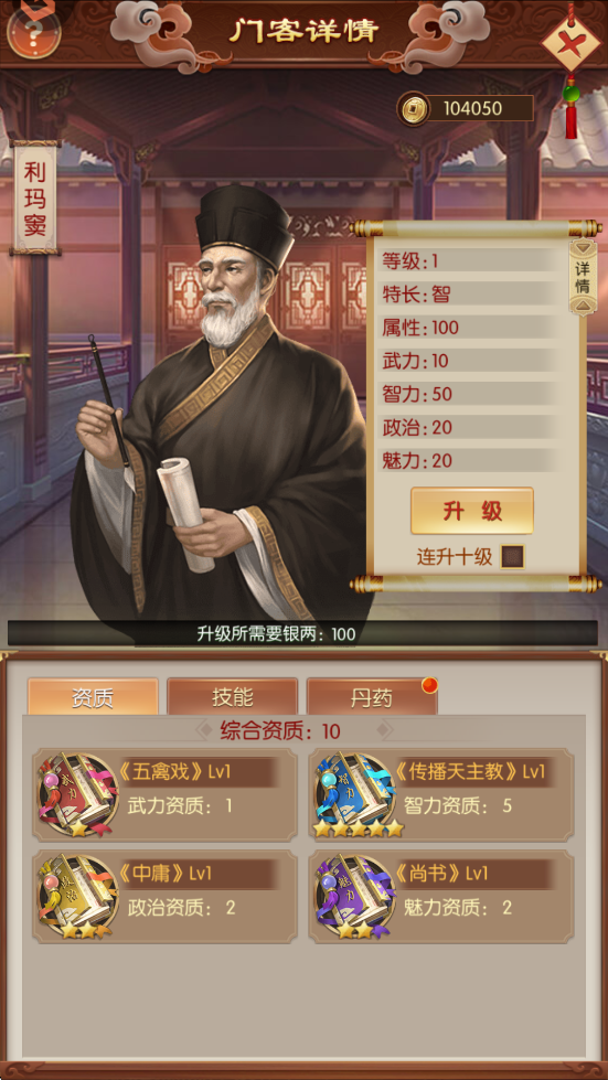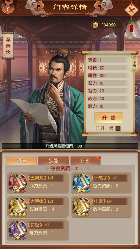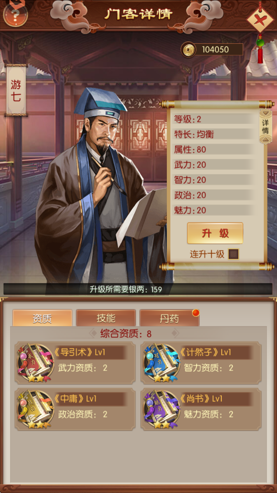 门客核心数值,等级越高,资质带来的属性加成越高,资质由武智政魅四类书籍提供。