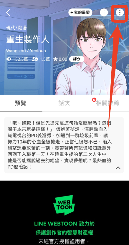 1、打开软件进入漫画详情页面后,点击右上方【三个点】。