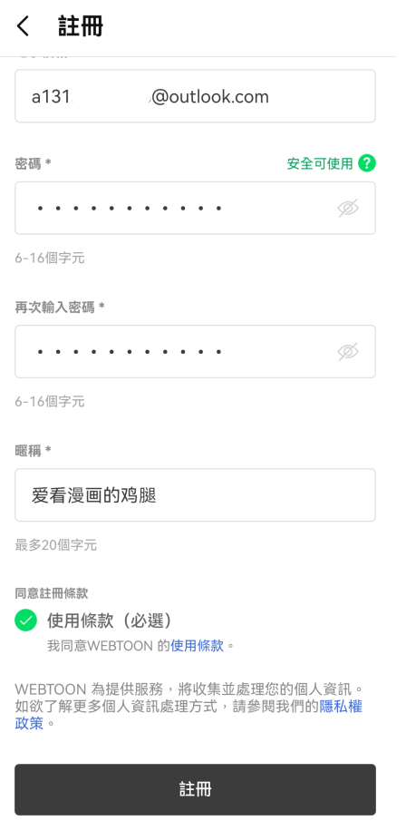 3、输入邮箱、密码和昵称,勾选使用条款,点击最下方的【注册】。