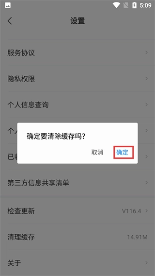 4、在清除缓存的确认弹出窗口中,单击[确定]按钮以完成缓存清理并释放应用程序占用的存储空间。