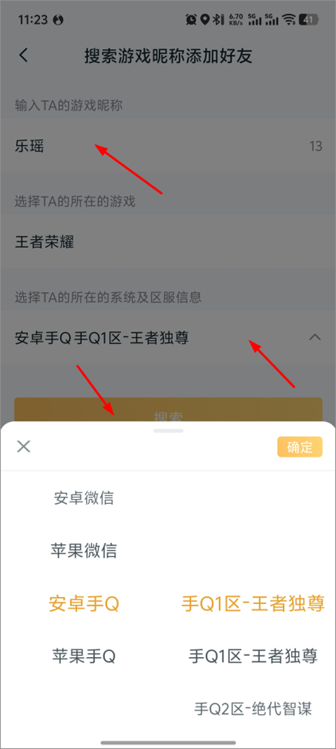 3、输入好友的游戏昵称,选择游戏系统服务器信息;