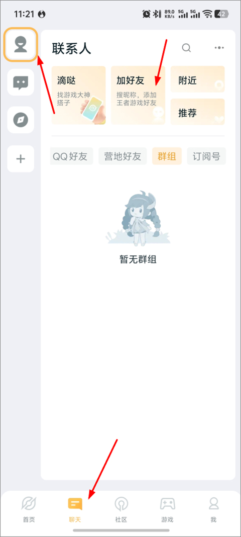 1、打开王者营地应用程序,点击下面的“聊天”,然后点击左上角的联系人,最后点击“添加好友”;