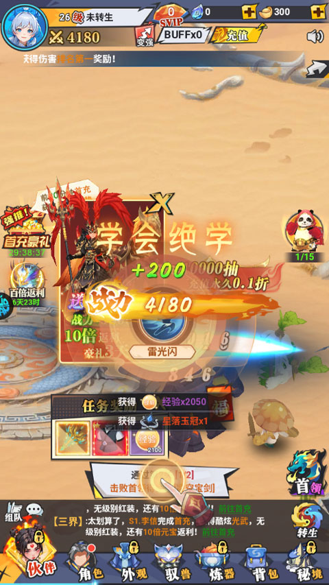 2、解锁生命角色,专精武功,使用经验丹升级坐骑/灵宠,激活专属技能和外貌。