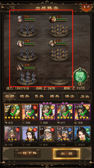 2、一般阵容都是两前排或者是三前排,无论是哪种方式,前排单位一定要放最肉的武将。战术武将除外,比如死亡可以触发特效的。后排放置输出位置和辅助位置,辅助武将不限于类型,比如奶妈、增益、减益、控制等等。