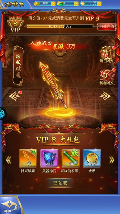 4、上线直升VIP8,各种VIP礼包免费领取。