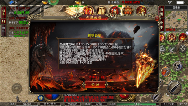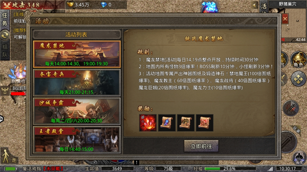地图内所有怪物3倍爆率!BOSS刷新10分钟小怪2分活动地图专属产出兵器谱锻造图纸!魔龙教主(100倍图纸爆率)魔龙战将(40倍图纸爆率)魔龙破甲兵和魔龙力士(20倍图纸爆率)铁翼巨蛾和魔龙巨蛾(10倍图纸爆率)地图不掉狂暴!PK不红名!