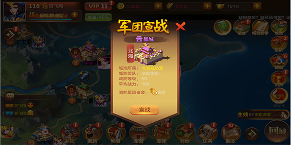 1、须宣战后,宣战军团方方可派兵进,相邻城池可宣战。