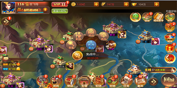 主公等级达到15级开放国战功能,玩家以军团势力为单位争夺世界地图中的城池。在世界地图中城池分为:都城县城关隘,都城需进行宣战才可开启国战,县城与关隘无需进行宣战,每日08时-23时为国战时段,该时段之外不可进行国战。