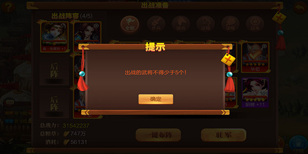 进入城战后,玩家可选择攻方/守方,派遣部队,每只部队由5个武将组成。