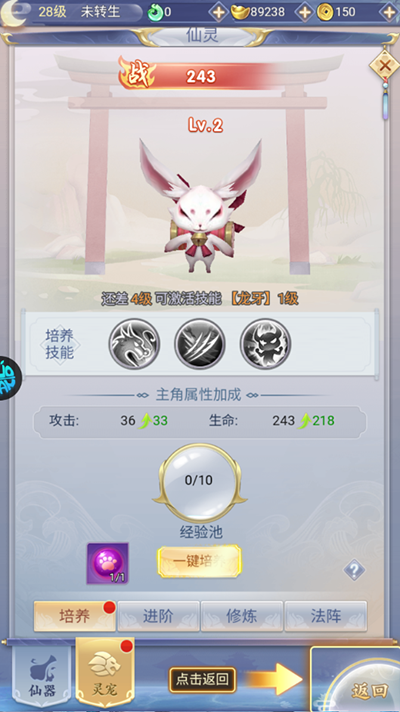 7、玩家闯到第二关boss就可以解锁灵宠培养,其它仙骑、仙翼等到达一定等级即可解锁。