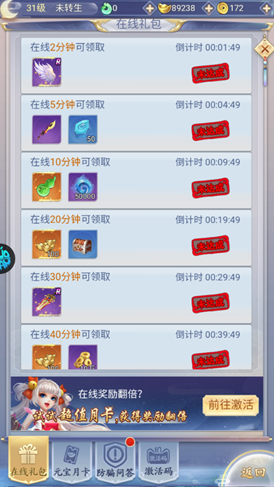 2、激活码:0C187IVKIISYD132低级经验丹*5,体力药剂*3。