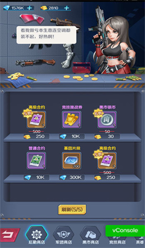 1、后勤商店:后勤商店里有高级合约,普通合约,竞技挑战券,基因片段等等商品,主要用金条和钻石购买。每个主页随机出现6个商品,好像每2个小时之内可免费刷新4次,之后想再刷新就需要金条啦,不想花金条刷新的小伙伴,可以等到两小时以后系统刷新再进行购买。