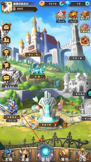 1、进入游戏首页,点击“冒险”。