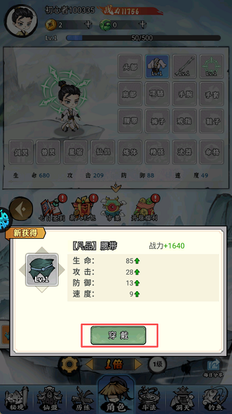 获得新装备后应立即【穿戴】,即使是凡品腰带也能直接增加战力,应尽快把所有装备栏填满。