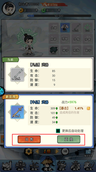 当获得中品武器等高战力装备时,直接【更换】掉旧装备,淘汰下来的装备可以选择【出售】换取资源,实现装备的循环更新和战力持续提升。