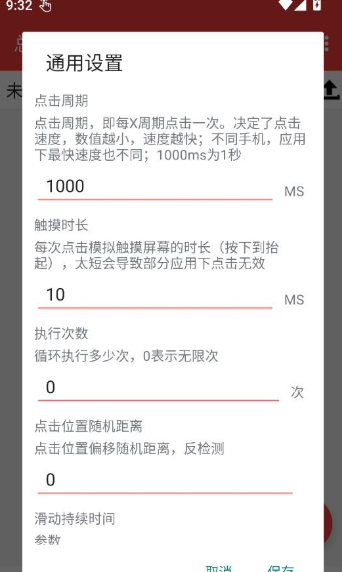 2、可以微调点击核心参数,包括点击周期、触摸持续时间、执行次数、点击位置的随机距离和滚动持续时间。