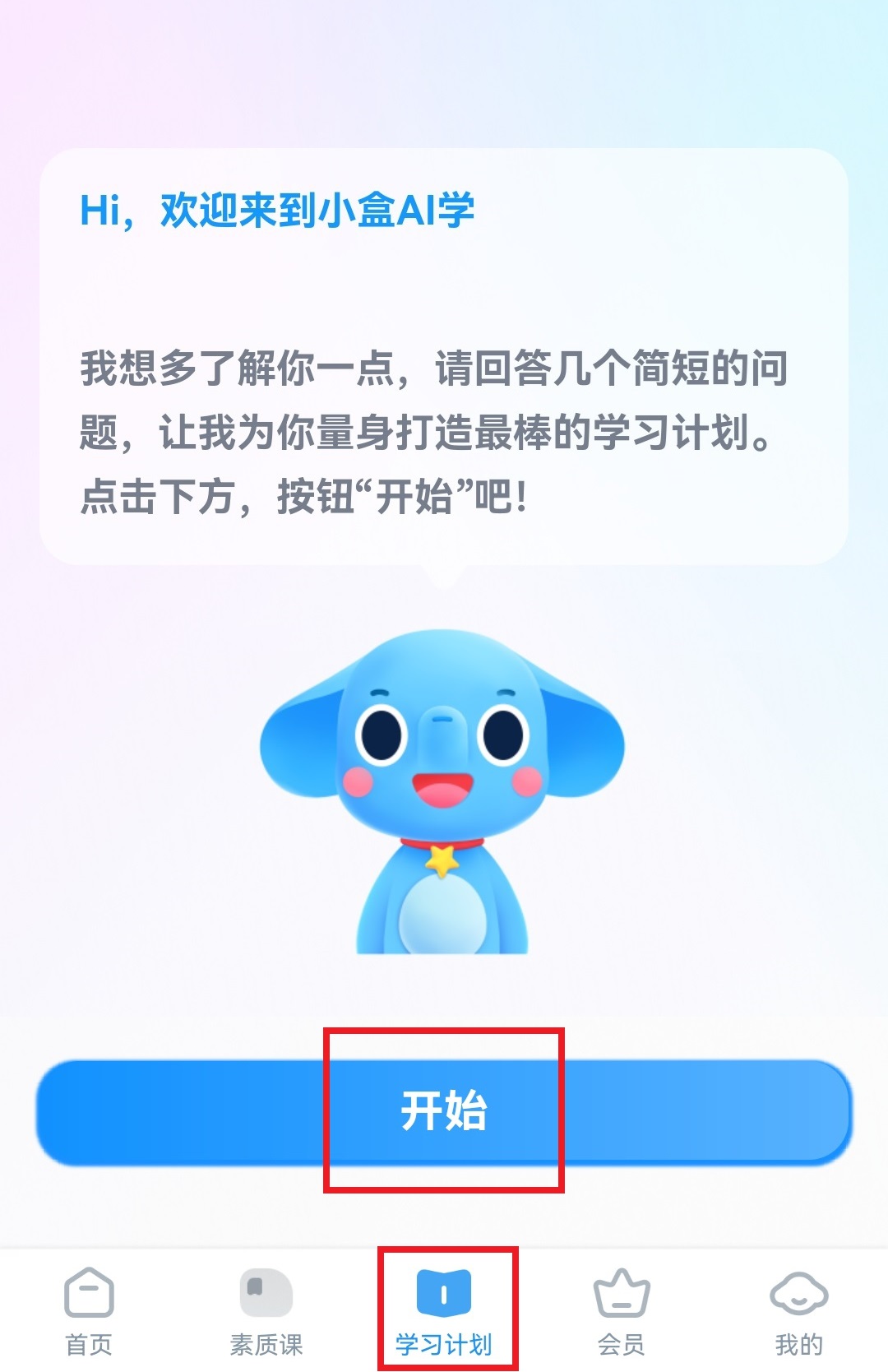 1、点击下面中间的“学习计划”。首先,你需要回答几个简短的问题,以帮助人工智能更好地理解你。准备就绪后,单击“开始”。