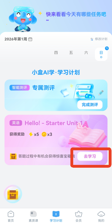 4、返回后,您将被重定向到学习计划页面,在那里您可以看到需要学习的目标。点击“去学习”开始今天的学习计划!