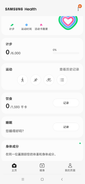 1、在本网站上下载并安装三星健康app,进入主页,您可以看到步数、运动、饮食、睡眠质量等。