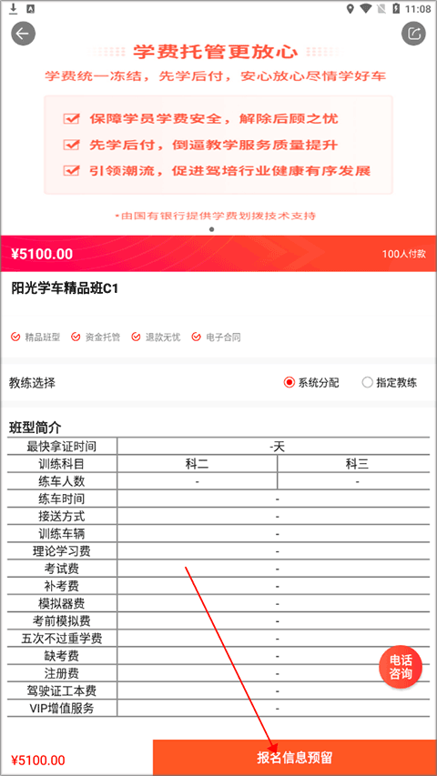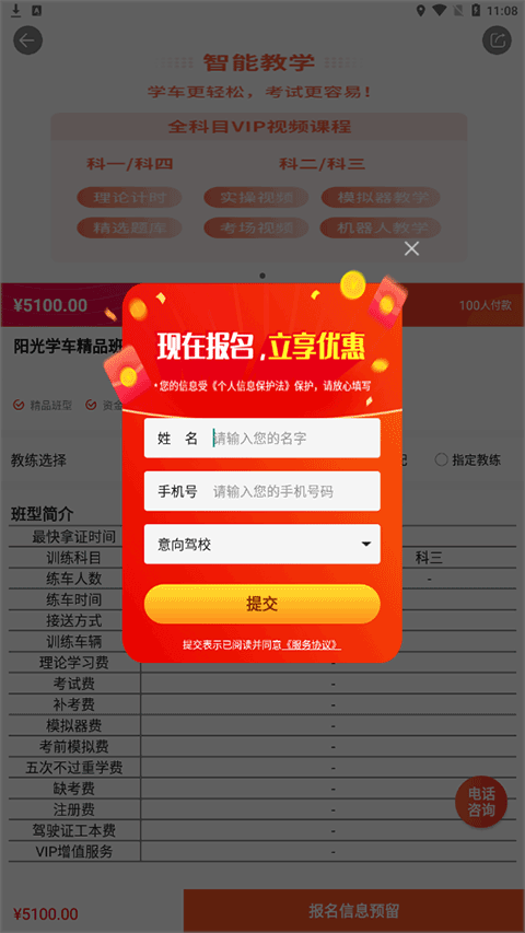 3、输入您的姓名、电话号码和预期的驾驶学校,然后单击提交。
