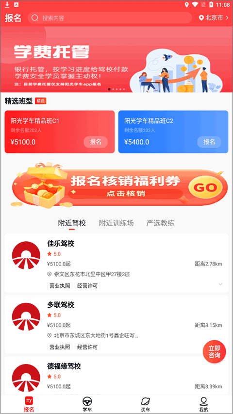 阳光学车是一款热门的免费驾考学习软件,拥有最新的驾考题库资源,允许用户自由浏览,随时随地进行练习,轻松掌握全面的驾考知识,还提供理论学习、预订驾校等各种实用功能,允许用户在线观看各种驾考知识视频和解析,快速提高驾考成绩,能完全满足所有驾考学习需求,还能进行专业培训和在线模拟考试,轻松体验真实的考试环境,给用户带来全面的学习氛围,自由顺利通过驾照考试,有需要的用户欢迎来下载软件。
