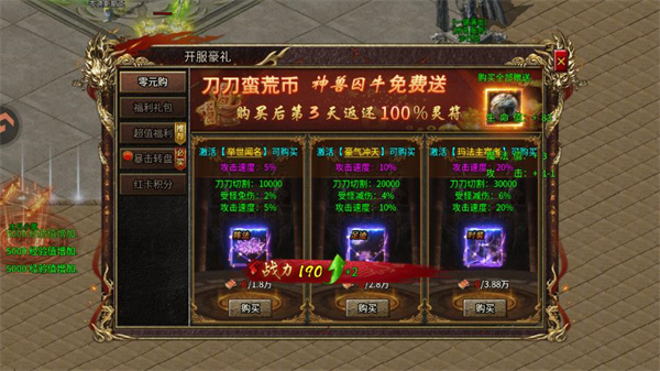 5、开荒好礼、超值投资、月卡均为超长线收益并且提供大量居性,解放双手。