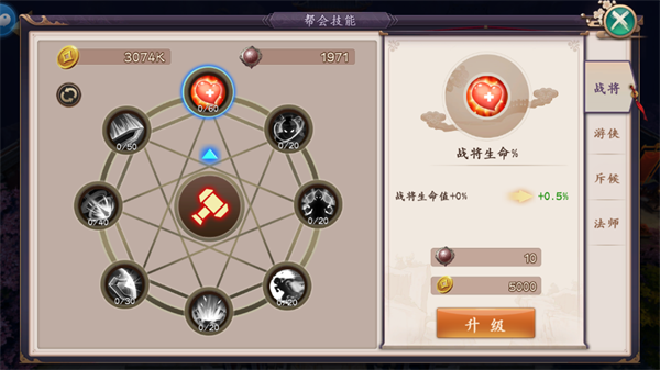 6、【职业大厅】在这里,帮会成员可以使用帮贡和金币,为四种职业提升帮会技能增加团队作战能力。