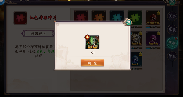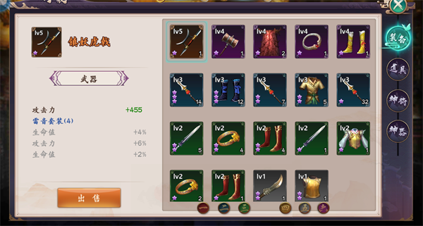 1、【行囊】系统分为:装备、道具、神将、神器四项存储栏。