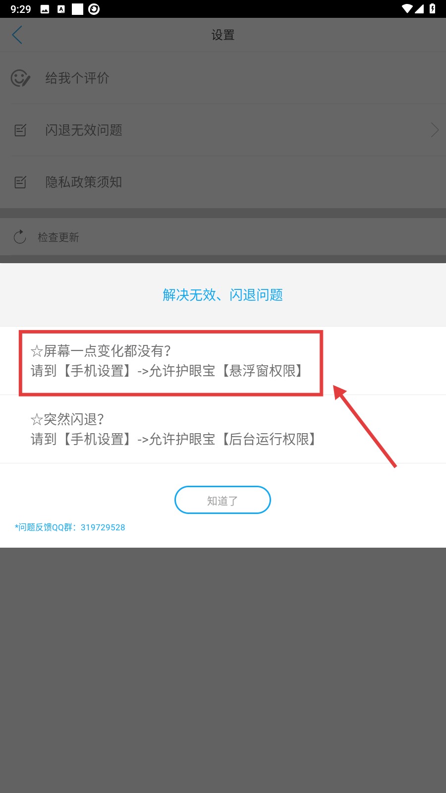 4、根据说明,在“手机设置”中,允许护眼宝具有“浮动窗口权限”,以便软件在使用时自动打开浮动窗口。
