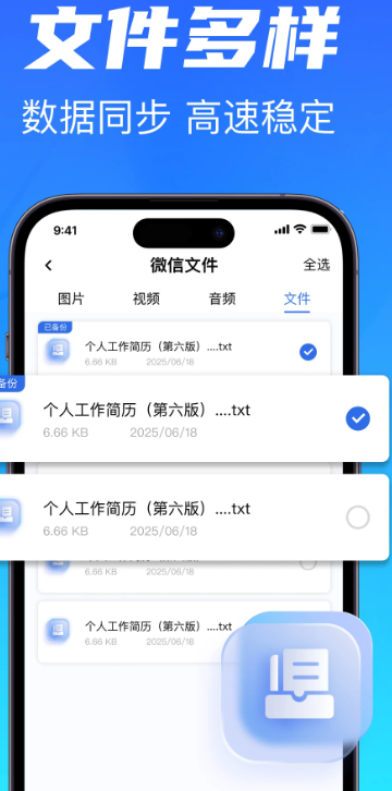 除了聊天记录,应用还提供照片、视频、音频等本地文件的一键式全量备份功能。当手机存储空间告急时,用户无需手动筛选删除,只需通过该应用将不常查看但又重要的文件转移至云端,即可释放手机空间,同时确保数据安全可访问。