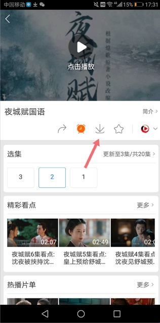 1、找到播放视频下方的下载箭头,点击下载按钮(下图中红色箭头所示)。