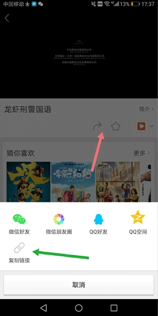 3、如果正在播放的视频没有提供下载频道,例如,如果在下图所示的页面上找不到下载频道,用户可以点击提供的共享按钮(下图中红色箭头所示),然后从底部弹出的选项中点击“复制链接”(下图中绿色箭头所示的),复制链接地址并将其下载到他们的移动浏览器。