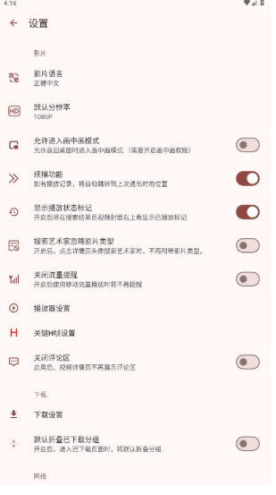3、在设置页面还可以进行各种细化分的设置,如默认分辨率、下载设置等。