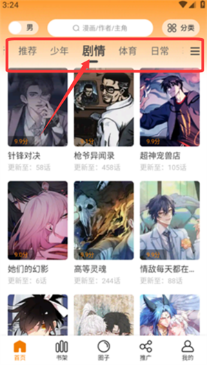 3、通过分类栏可选择推荐、少年或剧情等标签筛选内容。