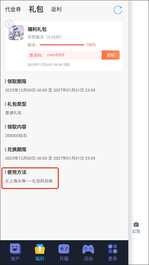 2、进入福利页面后,切换到“礼包”栏目,即可领取并复制当前可用的兑换码。
