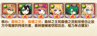 核心:森林之主、森镜之灵;森林之主和森镜之灵前排受击让敌方中毒提供持续伤害,森林缴械者窃取攻击,樱乃单点爆发!