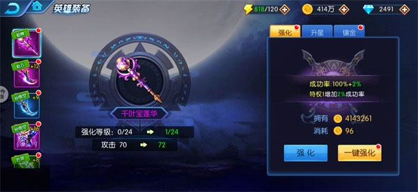 1、强化装备等级。消耗金币可提高装备等级,是最直接的提升装备属性的方式,为了方便镇魂师们强化装备,我们还提供“一键强化”功能。