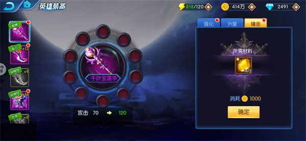 2、装备升星。消耗星石可提高装备属性,装备品质越高,消耗的星石越多,但属性提升也越多。