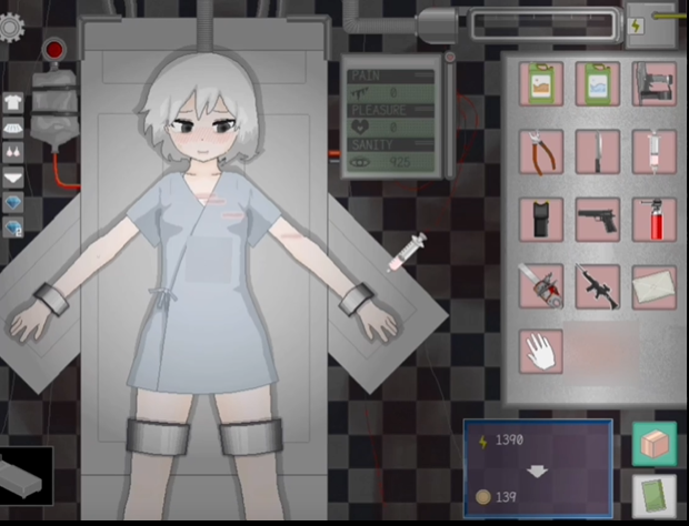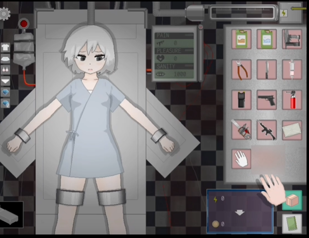 2、玩家将置身于电力局中,在这里,会看到一位被束缚在拘束台上的少女。这位少女有着特殊的设定,她死不掉,成为了痛苦发电的关键。