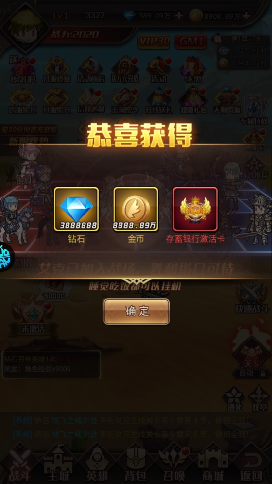2、登录游戏即可领取钻石、金币以及储蓄银行激活卡,这些初始资源将为你的战斗提供有力支持。