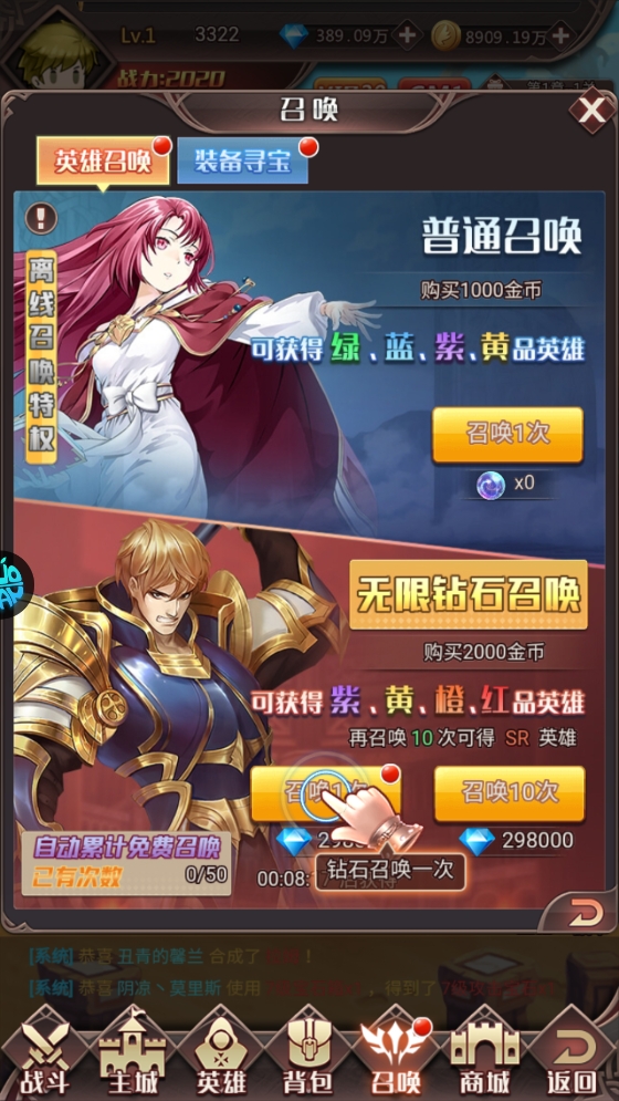 5、点击召唤功能即可召唤英雄,不断扩充你的勇士队伍,为守卫王国集结更强力量。