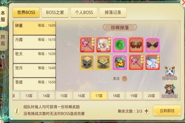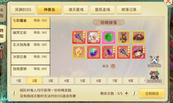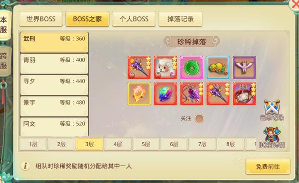 BOSS之家无次数限制,BOSS刷新后即可反复挑战。VIP等级越高,可进入的层数也越高。主要掉落装备、宠物、坐骑幻化、神魔武器、仙源玉、木椅、木桌、套装石及完美套装石。由于不限次数,建议玩家密切关注BOSS刷新提醒,并组队前往以提升效率,避免被抢怪。