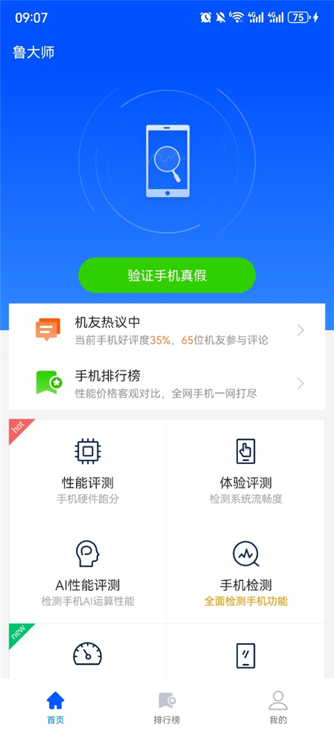 鲁大师是一款热门的手机检测软件,拥有智能化的手机检测功能,可以帮助用户全面评估手机,轻松了解手机各种信息,包括CPU,内存等数据,自由查看详细的介绍,还具有全新的界面设计,无需任何经验即可上手使用,随时随地查询手机评分,自由流畅使用手机,能完全满足所有使用需求,还提供丰富的功能选项,及时对手机进行优化,轻松延长手机使用寿命,给用户带来全面的手机检测服务,有需要的用户欢迎来下载软件。