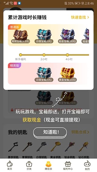 5、进入“赚取现金”界面,我们可以通过累计游戏时间获得宝箱。打开宝箱后,我们可以获得现金奖励。