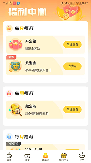 6、进入“福利中心”界面,您可以选择参加不同类型的福利活动,如每日福利、每周福利、每月福利等。